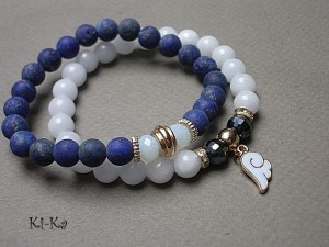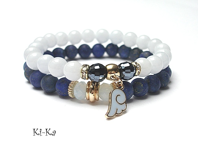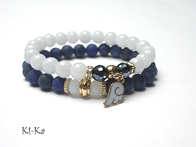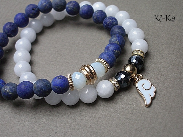 PROJEKT AUTORSKI. WŁASNOŚĆ KI-KA. KOPIOWANIE ZABRONIONE. Komplet dwóch bransoletek wykonany z naturalnych kamieni - matowe kuleczki lapisu lazuli [8mm] ,jadeity [8mm] , kryształki fasetowane [8mm], oraz elementów w kolorze tzw. różowego złota. Bransoletki na gumce silikonowej. Pasują na nadgarstek 16-17cm. Biżuteria ozdobnie zapakowana. Możliwość dopasowania bransoletki do nadgarstka - wcześniej prosimy o kontakt.