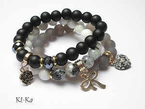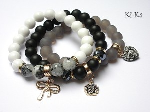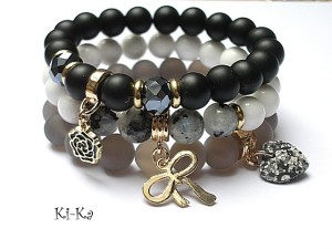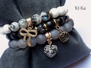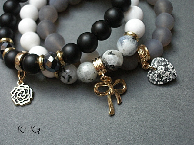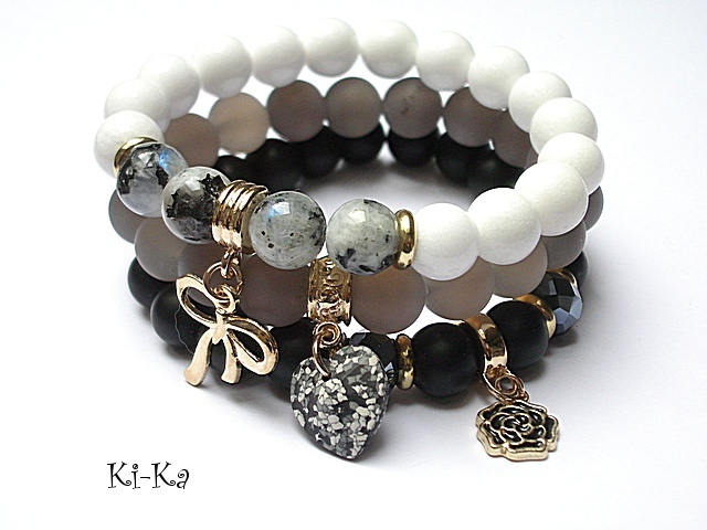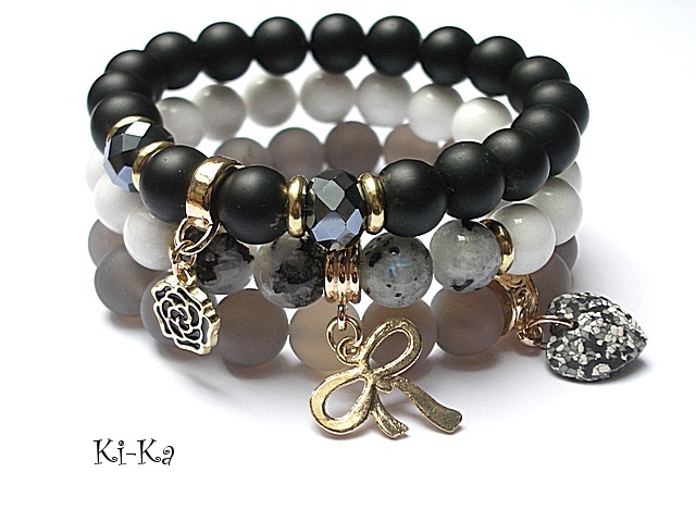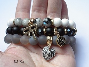 Komplet trzech bransoletek wykonanych z naturalnych kamieni [jadeity 10mm, black stone 10mm, agaty matowe 10mm, kamień księżycowy 10mm], kryształków [8 x 10mm], kryształka Swarovskiego w kształcie serduszka o ciekawej strukturze granitu oraz elementów metalowych w kolorze tzw. różowego złota. Bransoletki pasują na nadgarstek 15,5 - 16,5cm. Biżuteria ozdobnie zapakowana.
