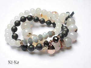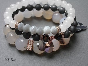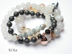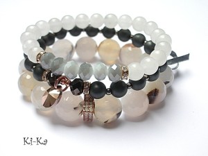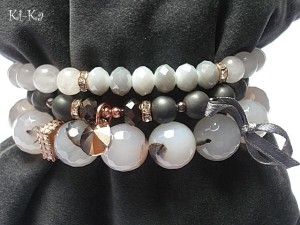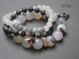 Komplet trzech bransoletek wykonany z kamieni naturalnych - fasetowane, duże agaty [12mm], hematyt matowy [8mm], jadeitów [8mm], kryształków [6 x 8mm], kryształka Swarovskiego, ekskluzywnej przekładki wysadzanej cyrkoniami, przekładek wysadzanych kryształkami oraz elementów w kolorze tzw. różowego złota. Pasują na nadgarstek 16 -17,5cm. Bransoletki na gumce silikonowej. Biżuteria ozdobnie zapakowana