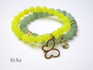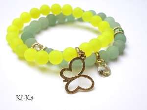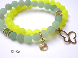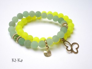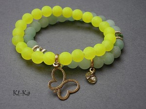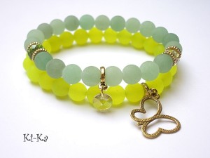 Komplet dwóch bransoletek wykonanych z naturalnych kamieni - jadeit matowy [8mm], awenturyn matowy [8mm], kryształków Swarovskiego [oponki 6 x 8mm i przywieszka] oraz elementów metalowych w kolorze złota. Bransoletki na gumce silikonowej. Pasują na nadgarstek 15,5 - 16,5cm. Biżuteria ozdobnie zapakowana.