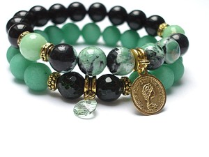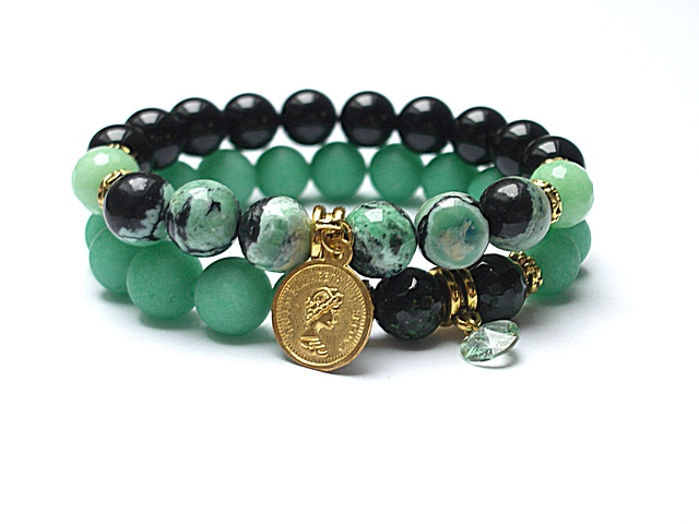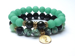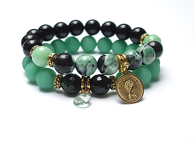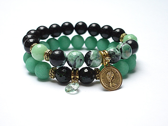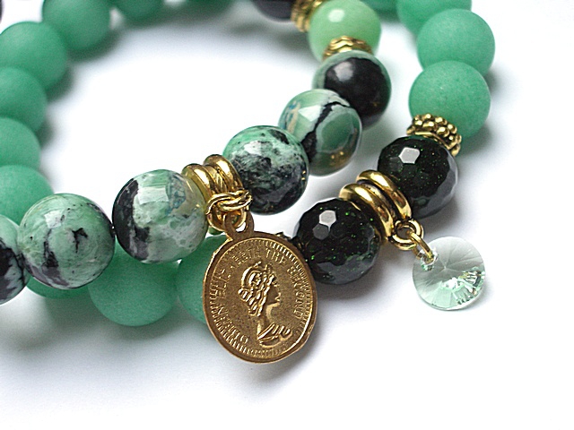 PROJEKT AUTORSKI. Komplet dwóch bransoletek wykonany z naturalnych kamieni - jadeit matowy [10m], jadeit fasetowany [10mm], jaspis [10mm], szmaragd nilu fasetowany [10mm], przywieszki z kryształkiem Swarovskiego oraz elementów w kolorze złota. Bransoletki na gumce silikonowej. Pasują na nadgarstek 16-17cm. Biżuteria ozdobnie zapakowana. Możliwość dopasowania bransoletki do nadgarstka - wcześniej prosimy o kontakt.
