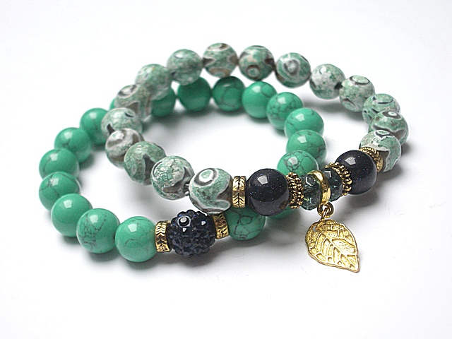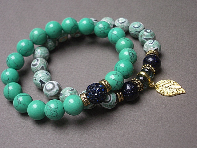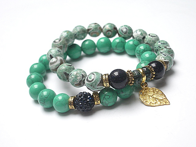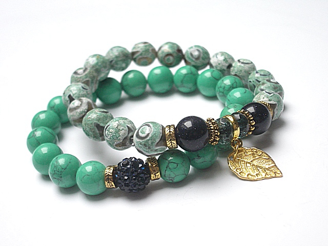 Komplet dwóch bransoletek wykonany z naturalnych kamienia: agaty [10mm], howlit [10mm], kuleczek szmaragdu nilu [10mm], kwarcu [6 x 4mm], kuleczki shamballa wysadzanej kryształkami Swarovskiego [10mm] oraz elementów metalowych w kolorze złota. Bransoletki na gumce silikonowej. Pasują na nadgarstek 16-17cm. Biżuteria ozdobnie zapakowana. Możliwość dopasowania bransoletki do nadgarstka - wcześniej prosimy o kontakt.
