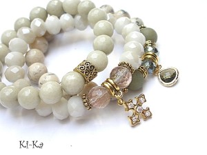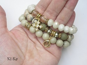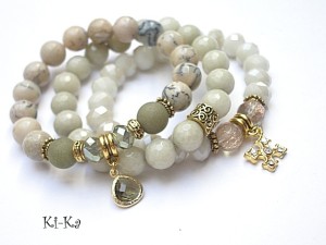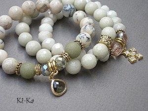 PROJEKT AUTORSKI. Własność KI-Ka. KOPIOWANIE ZABRONIONE. Komplet trzech bransoletek wykonanych z naturalnych kamieni - opale [10 mm], matowe jadeity [10mm], jadeity fasetowane [10 mm], fasetowane kuleczki kwarców ze złotymi drobinkami [10mm], kryształki [8mm i 10mm], szklanej zawieszki w mosiężnej oprawie platerowanej 24k zlotem oraz elementów metalowych w kolorze złota. Pasują na nadgarstek 16 - 17cm . Biżuteria ozdobnie zapakowana