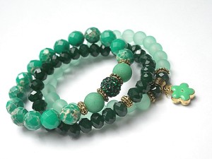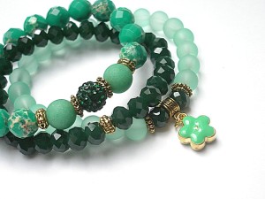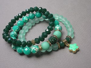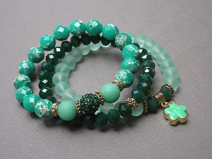 PROJEKT AUTORSKI. WŁASNOŚĆ KI-KA. KOPIOWANIE ZABRONIONE. Komplet trzech bransoletek wykonanych z naturalnych kamieni: howlit fasetowany [10mm], jadeity matowe [10mm], szkło matowe [8mm], kryształki fasetowane [6 x8mm], przekładki shamballa wysadzanej kryształkami Swarovskiego oraz elementów metalowych w kolorze złota. Bransoletki pasują na nadgarstek 16 - 17cm. Biżuteria ozdobnie zapakowana