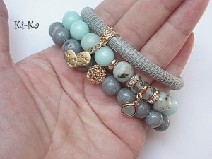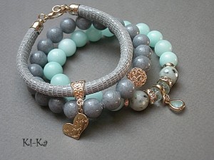 PROJEKT AUTORSKI. WŁASNOŚĆ KI-KA. KOPIOWANIE ZABRONIONE Komplet trzech bransoletek wykonanych z naturalnych kamieni - marmur [10mm], jadeity [10mm],jaspisy [10mm] ,fasetowane oponki kwarców aqua [8mm] przywieszki w okuciu skórzanego rzemienia ze skórki cielęcej o wężowym wzorze [6mm] oraz elementów metalowych w kolorze tzw. różowego złota. Bransoletki z kamieni na gumce silikonowej. Pasują na nadgarstek 16-17cm. W przypadku zmiany rozmiaru bransoletek prosimy o wcześniejszy kontakt. Biżuteria ozdobnie zapakowana.