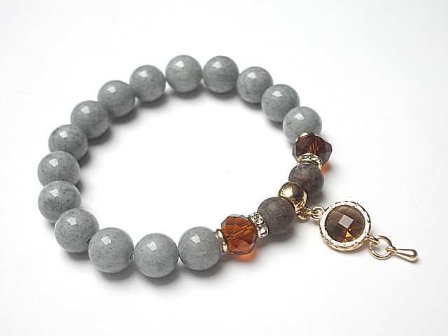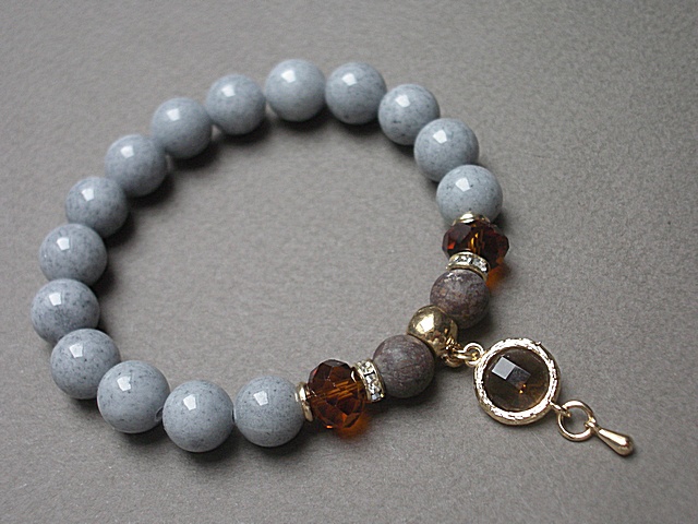 PROJEKT AUTORSKI. WŁASNOŚĆ KI-KA. KOPIOWANIE ZABRONIONE. Bransoletka wykonana z kamieni - jadeity [10mm], matowe obsydiany [8mm], kryształki [10mm], zawieszki w okuciu oraz elementów metalowych w kolorze złotym. Bransoletka na gumce silikonowej. Pasuje na nadgarstek 16-17cm. Biżuteria ozdobnie zapakowana. Możliwość dopasowania bransoletki do nadgarstka - wcześniej prosimy o kontakt