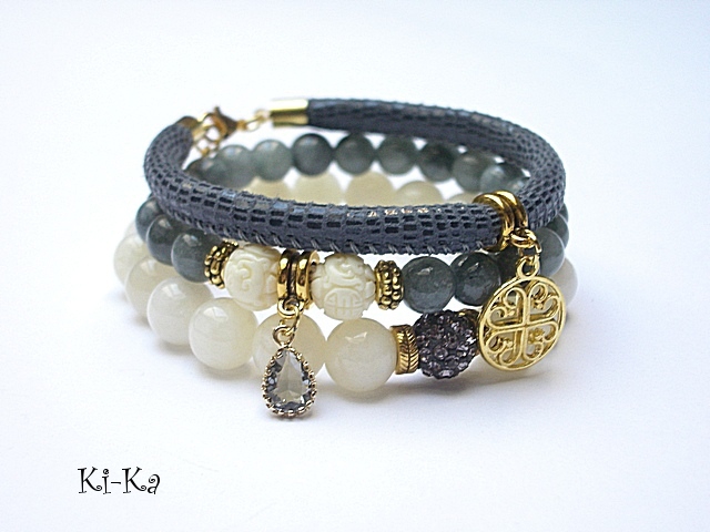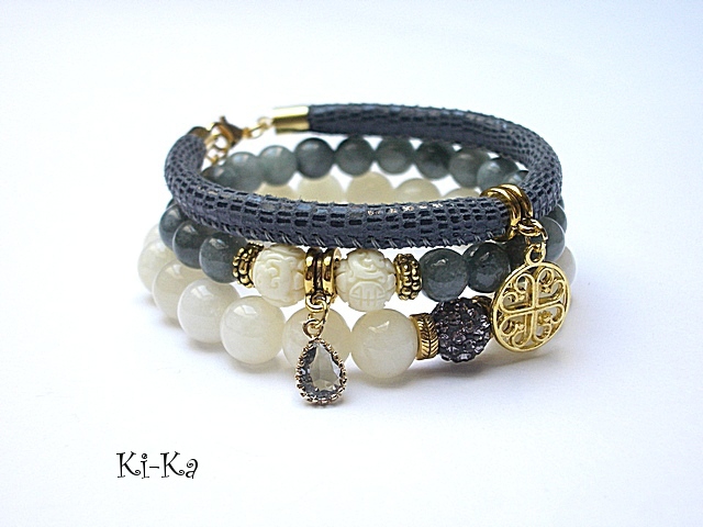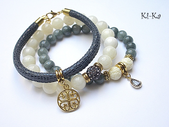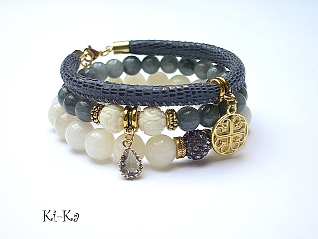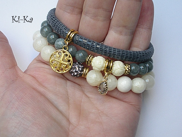 PROJEKT AUTORSKI. WŁASNOŚĆ KI-KA. KOPIOWANIE ZABRONIONE. Komplet trzech bransoletek wykonany z kamieni naturalnych - marmur [10 i 8mm], [10mm], rzeźbiona muszla [10mm], przekładka shamballa wysadzana kryształkami Swarovskiego, efektowna zawieszka ze szkła w oprawie z mosiądzu, rzemienia z naturalnej, miękkiej, koziej skóry oraz elementów metalowych w kolorze złota. Pasują na nadgarstek 16-17cm. Bransoletki z kamieni na gumce silikonowej. Biżuteria ozdobnie zapakowana.
