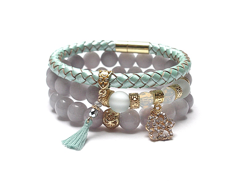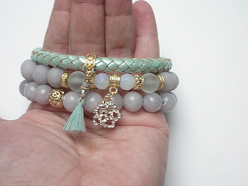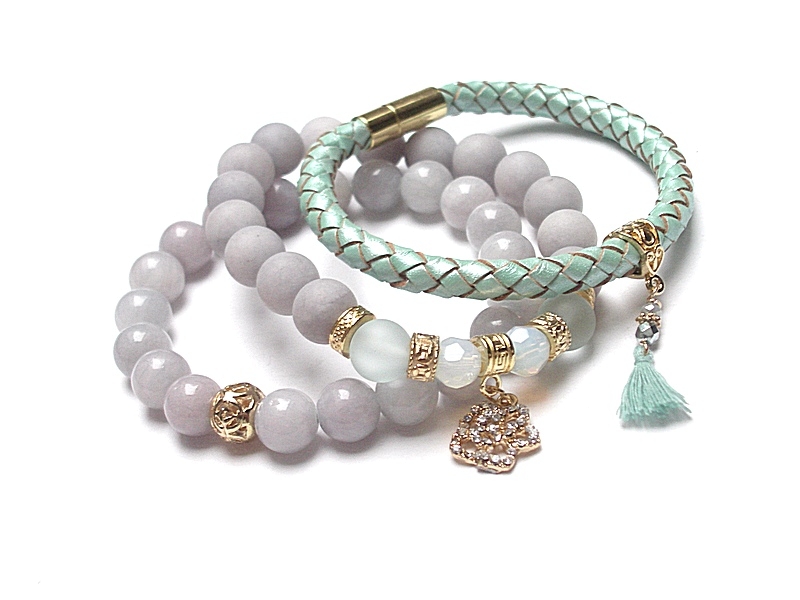 Komplet trzech bransoletek wykonanych z naturalnych kamieni: jadeity [10mm], matowe jadeity [10mm], matowy kwarc [10mm], kryształków [8mm], zawieszki z cyrkoniami, rzemienia z naturalnej metalicznej skóry [śr. 10mm], chwosta oraz elementów metalowych w kolorze złotym. Bransoletki pasują na nadgarstek 16-17cm. Biżuteria ozdobnie zapakowana
