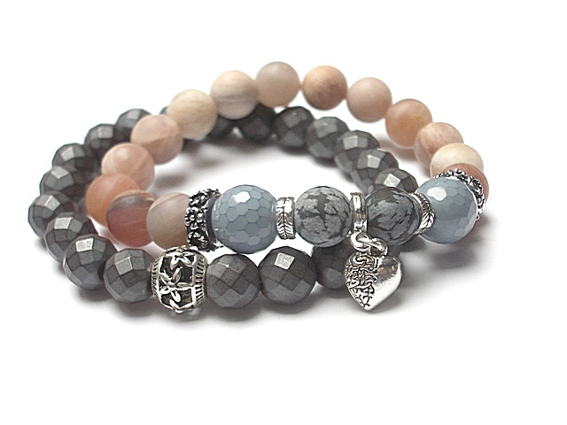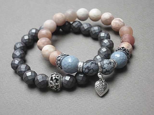 PROJEKTY AUTORSKIE. WŁASNOŚĆ KI-KA. KOPIOWANIE ZABRONIONE. Komplet dwóch bransoletek wykonany z naturalnych kamieni - kamień słoneczny matowy [10mm], obsydian matowy [10mm], agaty fasetowane [12mm], hematyt fasetowany [10mm] oraz elementów metalowych w kolorze srebra. Bransoletki na gumce silikonowej. Pasują na nadgarstek 16-17cm. Biżuteria ozdobnie zapakowana. Możliwość dopasowania bransoletki do nadgarstka - wcześniej prosimy o kontakt.