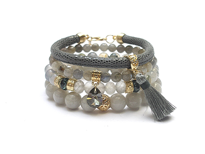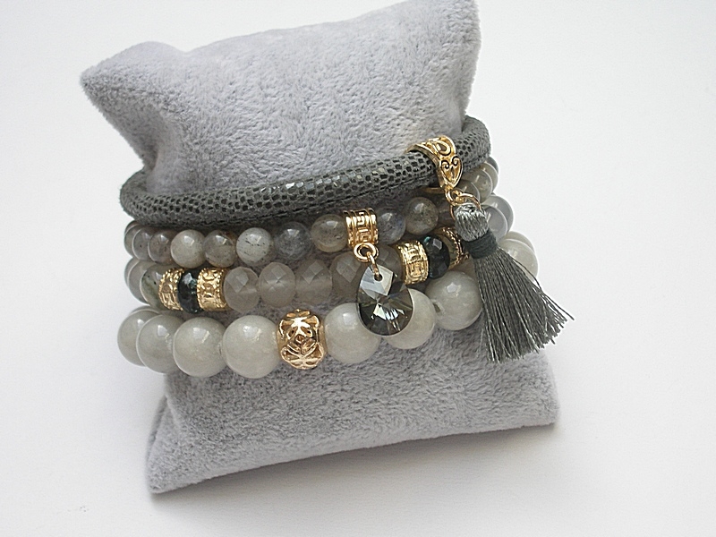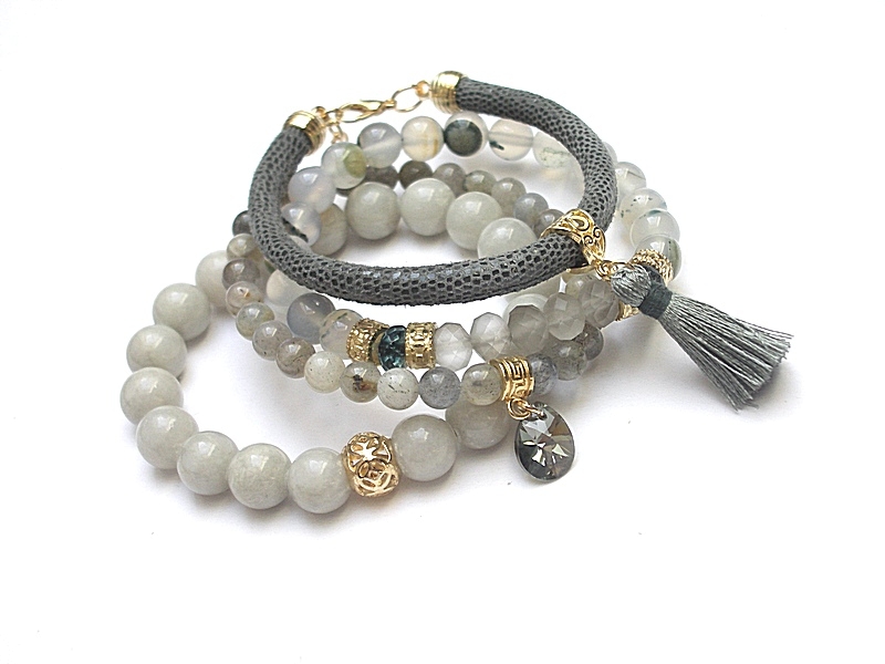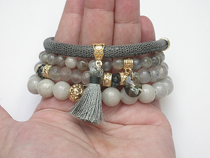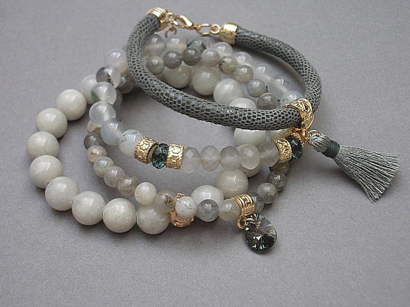 Komplet czterech bransoletek wykonanych z naturalnych kamieni - jadeity [10mm], agaty mszyste [8mm], labradoryty [6mm], kryształki [8mm], fasetowane oponki kwarców [8mm], zawieszki z kryształka Swarovskiego, skórzanego rzemienia z naturalnej skórki oraz elementów metalowych w złotym kolorze. Bransoletki pasują na nadgarstek 16-17cm. Biżuteria ozdobnie zapakowana.