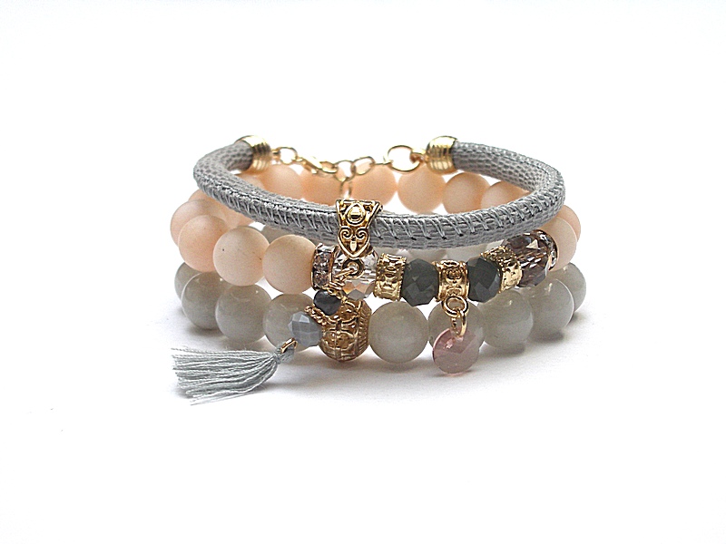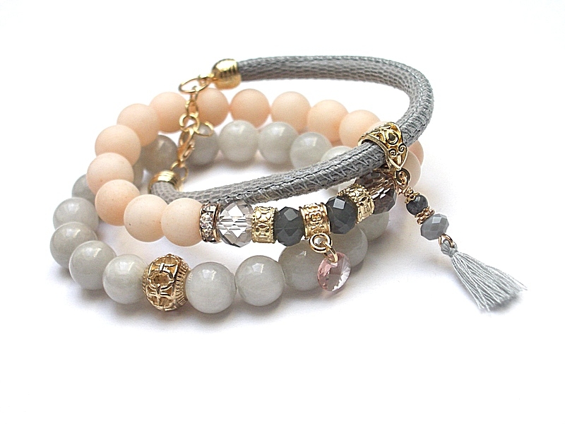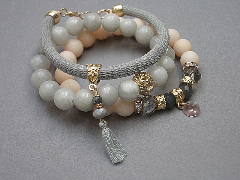 różowego złota. Bransoletki z kamieni i szkła na gumce silikonowej.