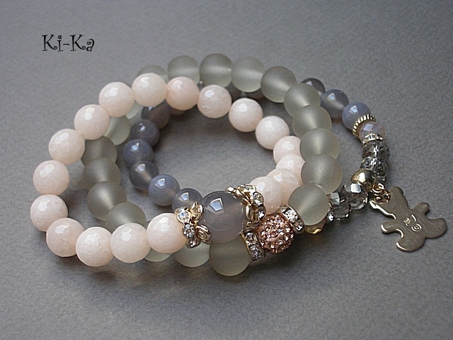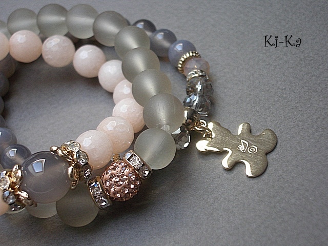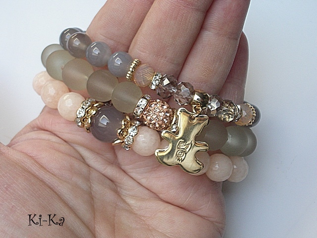 PROJEKT AUTORSKI. WŁASNOŚĆ KI-KA. KOPIOWANIE ZABRONIONE. Komplet trzech bransoletek wykonanych z naturalnych kamieni: agaty transparentne [10 i 14mm], jadeitów fasetowanych [10mm], szkła matowego [10mm], przekładki shamballa wysadzanej kryształkami Swarovskiego, przywieszki ze stali szlachetnej pozłacanej 18k złotem z logo Swarovski, kryształków fasetowanych [6 x 8mm] oraz elementów metalowych w kolorze złota. Bransoletki pasują na nadgarstek 16-17cm. Biżuteria ozdobnie zapakowana
