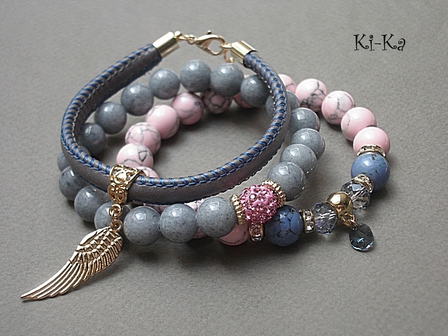 Komplet trzech bransoletek wykonanych z naturalnych kamieni: howlity [10mm], marmur [10mm], kryształków fasetowanych [8 x 6mm], przewieszki z kryształka Swarovskiego, skórzanego rzemienia z naturalnej skórki oraz elementów metalowych w kolorze tzw. różowego złota. Bransoletki pasują na nadgarstek 16-17cm. Biżuteria ozdobnie zapakowana. Możliwość dopasowania do innego nadgarstka. Wcześniej prosimy o kontakt.
