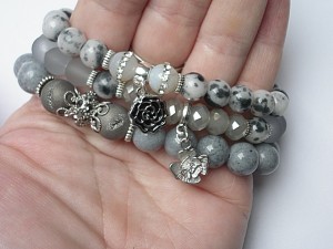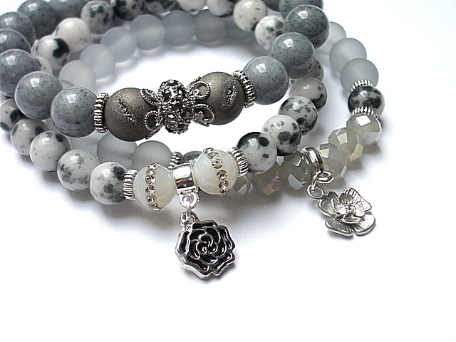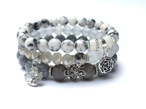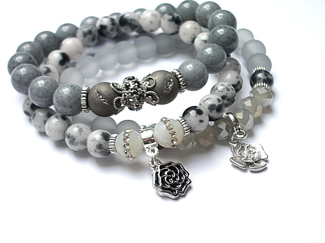Komplet trzech bransoletek wykonanych z naturalnych kamieni: jadeity [10mm],wyselekcjonowane dwie kuleczki druz agatów [ 10mm] ,agaty wysadzane cyrkoniami [8mm] ,jadeity [8mm] ,szklane matowe kuleczki [8mm] ,kryształki [8mm] ,przekładka z cyrkoniami oraz elementów metalowych w kolorze srebrnym. Bransoletki pasują na nadgarstek 15 - 16,5cm. Biżuteria ozdobnie zapakowana