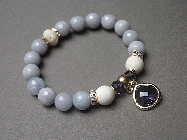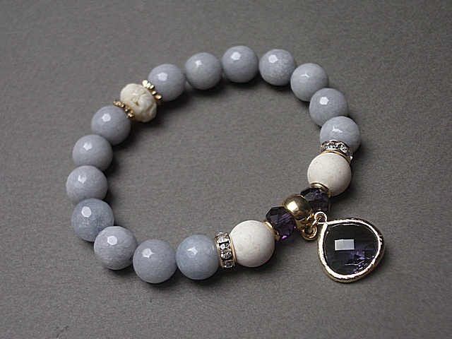 PROJEKTY AUTORSKIE. Bransoletka wykonana z kamieni - fasetowane jadeity [10mm], matowy marmur [10mm],kryształki [8mm] , przekładka z korala rzeźbionego [12mm], zawieszki w oprawie oraz elementów metalowych w kolorze złota. Bransoletka na gumce silikonowej. Pasuje na nadgarstek 16-17cm. Biżuteria ozdobnie zapakowana.