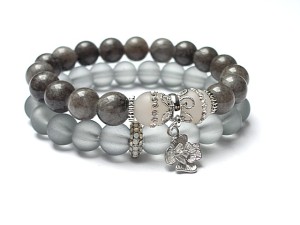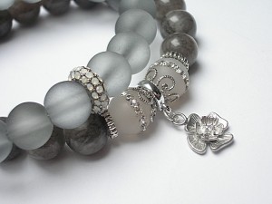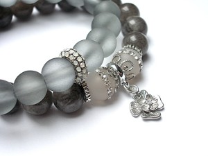 PROJEKT AUTORSKI. WŁASNOŚĆ KI-KA Komplet dwóch bransoletek wykonanych z naturalnych kamieni - marmur [10mm], agaty wysadzane crykoniami [10mm] , matowego szkła [10mm], ekskluzywnej przekładki wysadzanej cyrkoniami oraz elementów metalowych w kolorze srebra. Bransoletki pasują na nadgarstek 16-17cm . Biżuteria ozdobnie zapakowana
