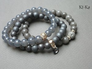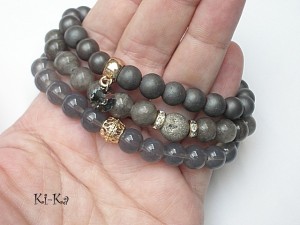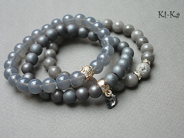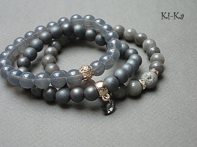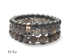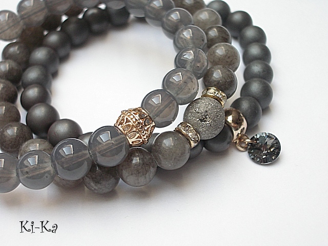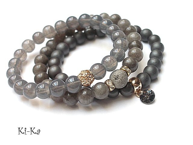 PROJEKTY AUTORSKIE. WŁASNOŚĆ KI-KA. KOPIOWANIE ZABRONIONE. Komplet trzech bransoletek wykonanych z naturalnych kamieni: hematyty matowe [8mm], marmur [8mm], agat z widocznymi druzami pokrytymi tytanem [10mm], szklanych kuleczek [8mm], przywieszki z kryształkiem Swarovskiego oraz elementów metalowych w kolorze złotym. Bransoletki pasują na nadgarstek 16-17cm. Biżuteria ozdobnie zapakowana.