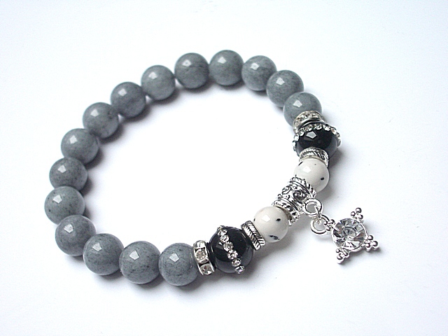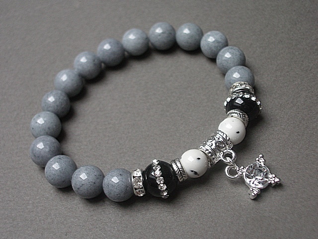 PROJEKTY AUTORSKIE. Bransoletka wykonana z naturalnych minerałów - onyksy wysadzane cyrkoniami [10mm], jadeity [10mm i 8mm] oraz elementów metalowych w kolorze srebrnym. Bransoletka na gumce silikonowej. Pasuje na nadgarstek 16-17cm. Biżuteria ozdobnie zapakowana. Możliwość dopasowania do nadgarstka - wcześniej prosimy o kontakt.