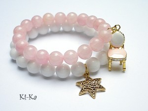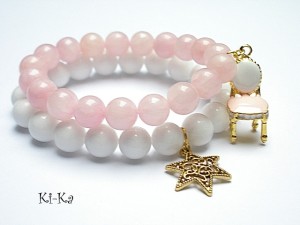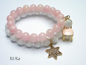 Komplet dwóch bransoletek wykonanych z naturalnych minerałów - jadeity [10mm] oraz elementów w kolorze złota. Bransoletki na gumce silikonowej. Pasują na nadgarstek 15-16,5cm. Biżuteria ozdobnie zapakowana.