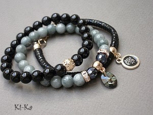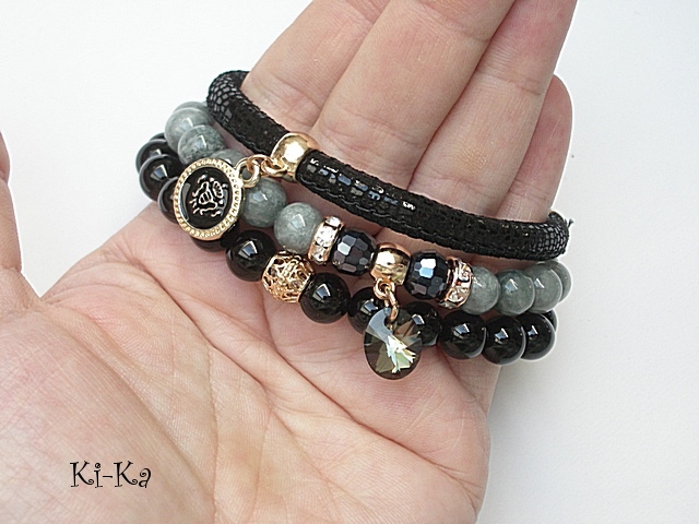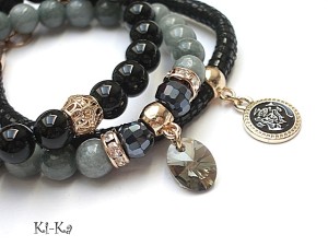 PROJEKTY AUTORSKIE. WŁASNOŚĆ KI-KA. KOPIOWANIE ZABRONIONE. Komplet trzech bransoletek wykonanych z naturalnych kamieni - marmur [8mm], onyks [10mm], kryształki fasetowane [8mm], rzemień z naturalnej skórki [6mm] , zawieszki - kryształka Swarovskiego oraz elementów metalowych w kolorze tzw. różowego złota. Bransoletki pasują na nadgarstek 16-17cm. Biżuteria ozdobnie zapakowana
