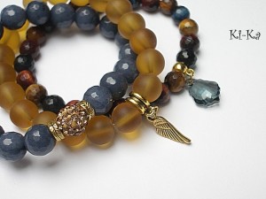 PROJEKT AUTORSKI. WŁASNOŚĆ KI-KA. Komplet trzech bransoletek wykonanych z naturalnych kamieni: jadeity fasetowane [10mm], tygrysie oko [10mm], sokole oko [10mm], bawole oko [10mm], matowego szkła [10mm], przekładki shamballa wysadzanej kryształkami Swarovskiego, przywieszki z kryształkiem Swarovskiego oraz elementów metalowych w kolorze złota. Bransoletki pasują na nadgarstek 16 - 17cm. Biżuteria ozdobnie zapakowana