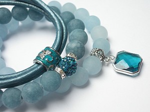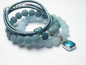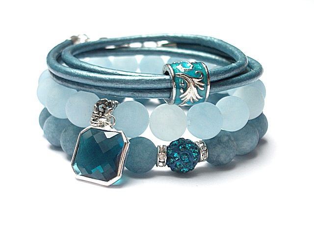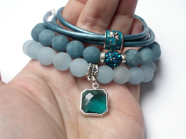 PROJEKT AUTORSKI. WSZELKIE INNE PODOBNE MODELE TO KOPIE NARUSZAJĄCE PRAWA AUTORSKIE. Komplet trzech bransoletek wykonanych z naturalnych kamieni: matowe jadeity w kolorze chłodnego błękitu i denimowym [10mm], efektownej zawieszki w okuciu skórzanego metalicznego rzemienia [skóra naturalna],kuleczki shamballa wysadzanej kryształkami Swarovskiego [10mm] oraz elementów metalowych w kolorze srebrnym . Bransoletki pasują na nadgarstek 16-17cm. Biżuteria ozdobnie zapakowana