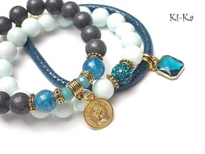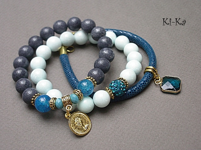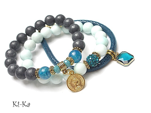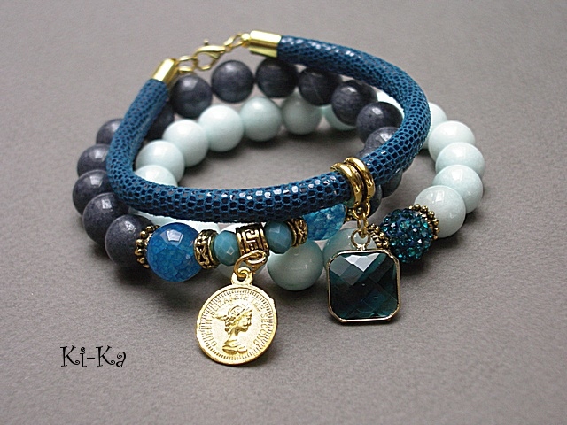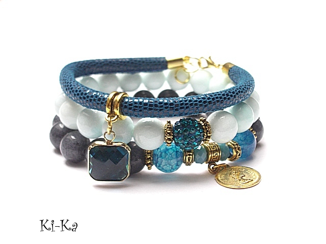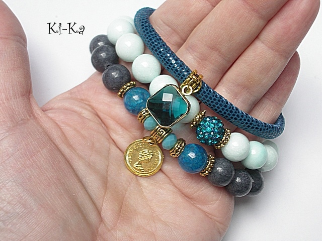 PROJEKT AUTORSKI. WŁASNOŚĆ KI-KA. KOPIOWANIE ZABRONIONE Komplet trzech bransoletek wykonanych z naturalnych kamieni: jadeity [10mm], agaty [10mm], kryształki fasetowane [8 x 6mm], kuleczki shamballa wysadzanej kryształkami Swarovskiego [10mm], zawieszki ze szkła, rzemienia z naturalnej, miękkiej skórki [6mm] oraz elementów metalowych w kolorze złota. Bransoletki pasują na nadgarstek 16-17cm. Biżuteria ozdobnie zapakowana