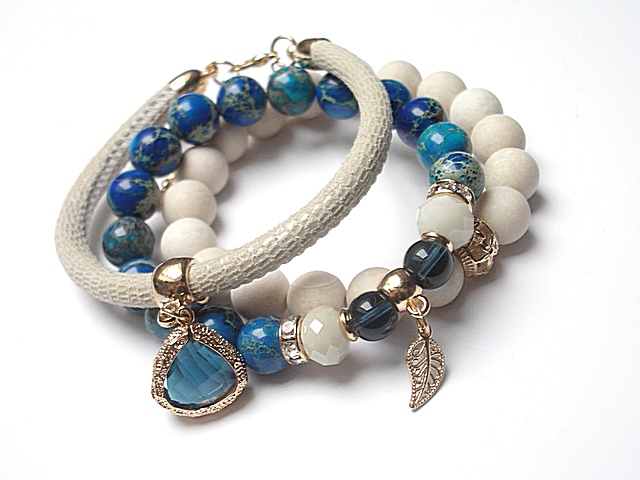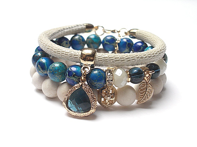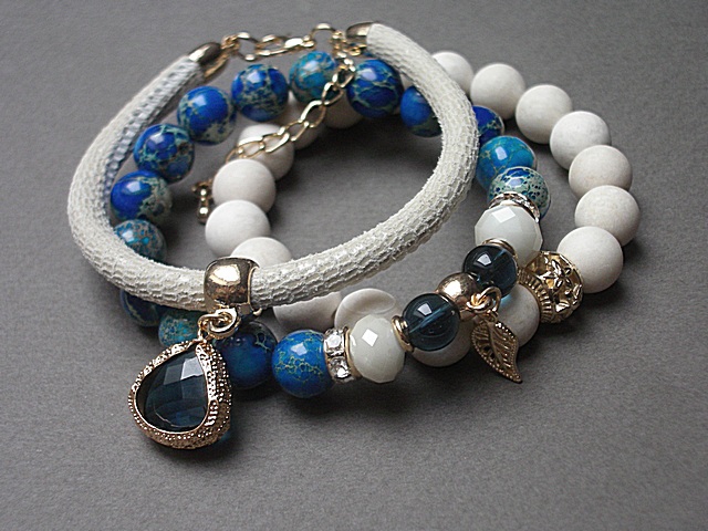 PROJEKT AUTORSKI. Komplet trzech bransoletek wykonany z kamieni naturalnych - matowy marmur [10mm], jaspis cesarski [10 mm], zawieszki ze szkła w oprawie, krysztalków [10mm], szklanych kuleczek [8mm], rzemienia z naturalnej, miękkiej, koziej skóry [śr. 6mm] oraz elementów metalowych w kolorze tzw. różowego złota. Pasują na nadgarstek 16-17cm. Bransoletki z kamieni na gumce silikonowej. Biżuteria ozdobnie zapakowana.