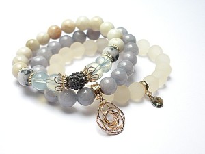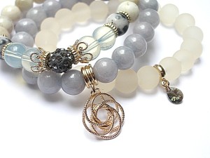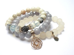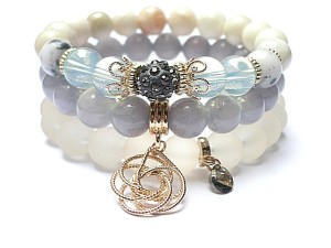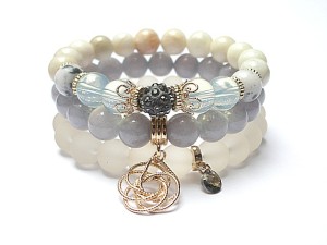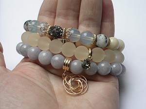 PROJEKT AUTORSKI. WSZELKIE INNE PODOBNE MODELE TO KOPIE NARUSZAJĄCE PRAWA AUTORSKIE. Komplet trzech bransoletek wykonanych z naturalnych kamieni: jadeity [10mm], kamień księżycowy [10mm], marmur [10mm], szkła [10mm], przekładki shamballa wysadzanej kryształkami Swarovskiego, przywieszki z kryształkiem Swarovskiego oraz elementów metalowych w kolorze tzw. różowego złota. Bransoletki pasują na nadgarstek 15,5 - 16,5cm. Biżuteria ozdobnie zapakowana
