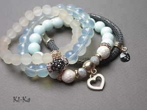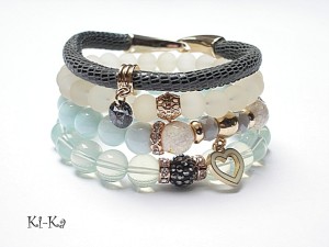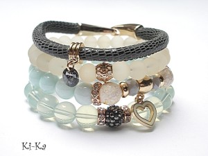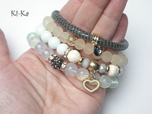PROJEKT AUTORSKI. KOPIOWANIE ZABRONIONE. Komplet trzech bransoletek wykonanych z naturalnych kamieni: jadeity [10mm], fasetowane agaty [10mm], szklane kuleczki [10mm], szklane matowe kuleczki [8mm], kryształki [8mm], przekładki shamballa wysadzanej kryształkami Swarovskiego [10mm] , przywieszki z kryształkiem Swarovskiego oraz elementów metalowych w kolorze tzw. różowego złota. Bransoletki pasują na nadgarstek 16-17cm. Biżuteria ozdobnie zapakowana