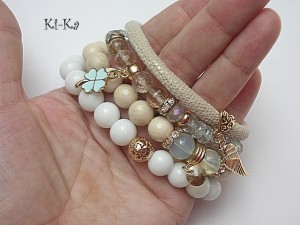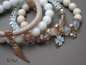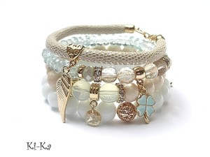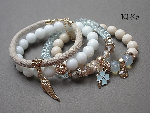 PROJEKT AUTORSKI. KOPIOWANIE ZABRONIONE. Komplet czterech bransoletek wykonanych z naturalnych kamieni: kwarc z drobinkami złota [8mm], oponki fasetowanego kwarcu niebieskiego [6 x 8mm], fasetowany marmur [10mm], szklanych kuleczek [10mm], przywieszki z kryształkiem Swarovskiego, rzemienia z naturalnej, miękkiej skóry cielęcej [śr. 6mm] oraz elementów metalowych w kolorze tzw. różowego złota. Bransoletki pasują na nadgarstek 16-17cm. Biżuteria ozdobnie zapakowana