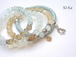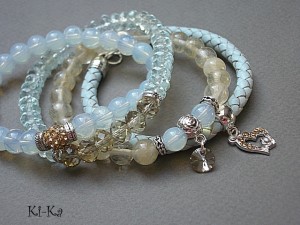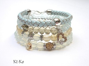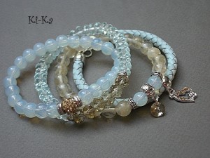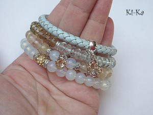 PROJEKT AUTORSKI. KOPIOWANIE ZABRONIONE. Komplet czterech bransoletek wykonanych z naturalnych kamieni: kwarc kawowy [8mm], oponki fasetowanego kwarcu niebieskiego [6 x 8mm], szklanych kuleczek [8mm], przywieszki z kryształkiem Swarovskiego, rzemienia z naturalnej, plecionej skóry, kryształków fasetowanych [6 x 8mm] oraz elementów metalowych w kolorze srebra. Bransoletki pasują na nadgarstek 16-17cm. Biżuteria ozdobnie zapakowana