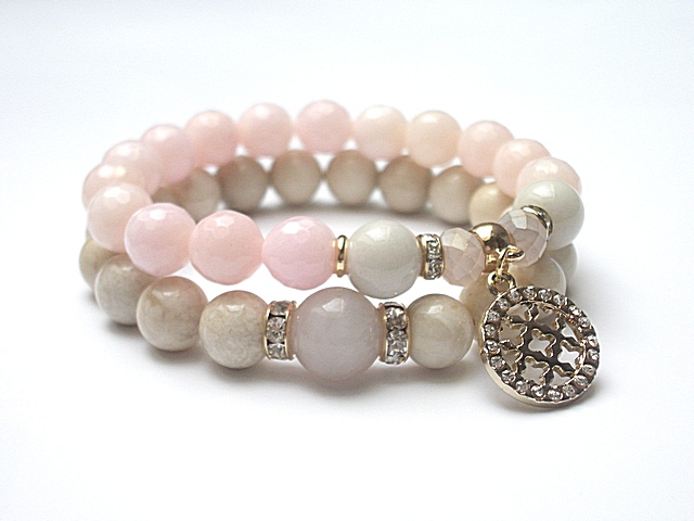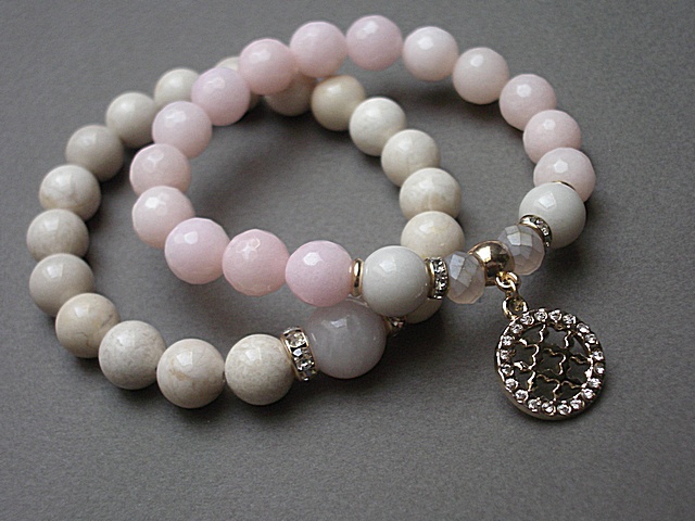 Komplet dwóch bransoletek wykonanych z naturalnych minerałów: jadeity fasetowane [10mm] ,marmur [10mm], kuleczka jadeitu [12mm], kryształki [8mm], zawieszka wysadzana cyrkoniami oraz elementów metalowych w kolorze różowego złota. Bransoletki pasują na nadgarstek 16-17cm. Biżuteria ozdobnie zapakowana. Projekt autorski. Naśladownictwo zabronione. Praca datowana.