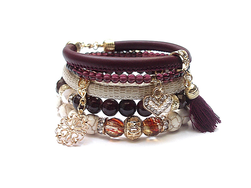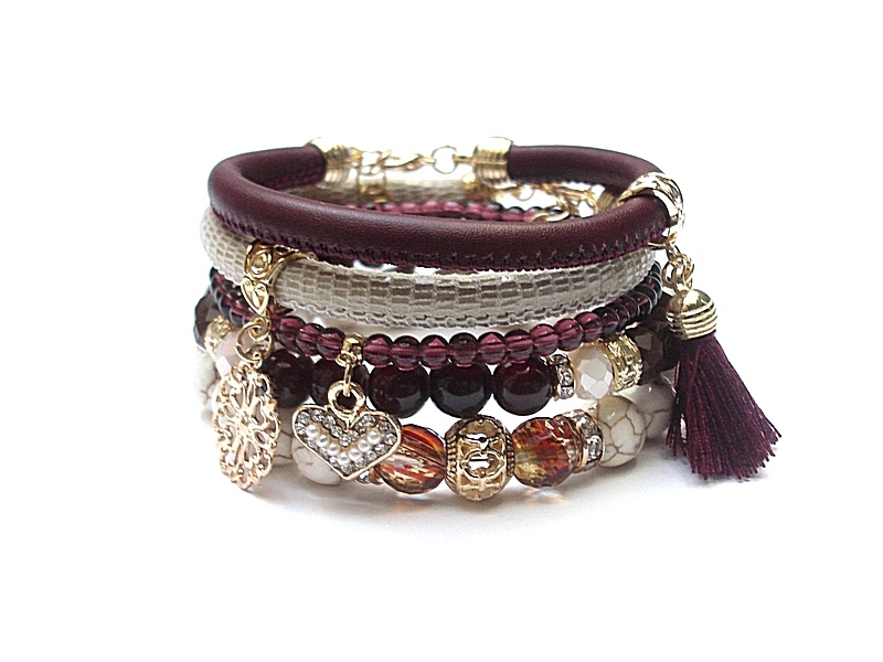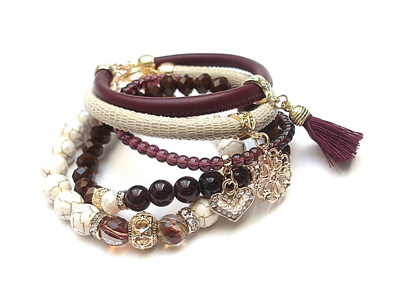Komplet pięciu bransoletek wykonanych z naturalnych kamieni: kwarc ze złotymi drobinkami [10mm],howlity [10mm] , marmur [8mm], kryształków fasetowanych [8mm ],szklanych kuleczek [4mm]. skórzanych rzemieni z naturalnej skórki koziej, chwosta oraz elementów metalowych w kolorze złota. Bransoletki pasują na nadgarstek 16-17cm. Biżuteria ozdobnie zapakowana. Możliwość dopasowania bransoletek do innego nadgarstka - wcześniej prosimy o kontakt.