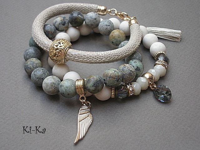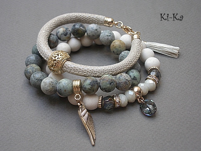PROJEKT AUTORSKI. WŁASNOŚĆ KI-KA. KOPIOWANIE ZABRONIONE. Komplet trzech bransoletek wykonanych z naturalnych kamieni: surowe kuleczki turkusów afrykańskich [10mm], matowe kuleczki marmurów [10mm], kryształki [8mm], zawieszki z kryształka Swarovskiego, rzemienia z naturalnej, miękkiej, koziej skóry [śr. 5mm], satynowego chwostu oraz elementów metalowych w kolorze tzw. różowego złota. Bransoletki pasują na nadgarstek 16-17cm. Biżuteria ozdobnie zapakowana. Możliwość dopasowania setu do innego rozmiaru nadgarstka - wcześniej prosimy o kontakt