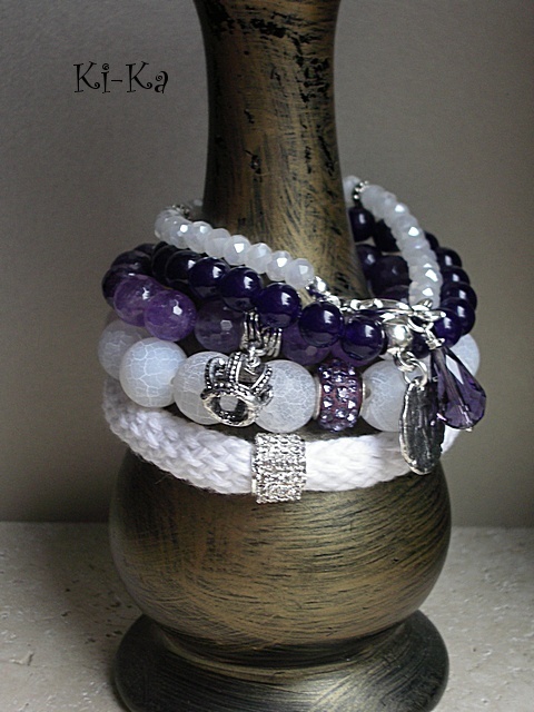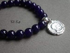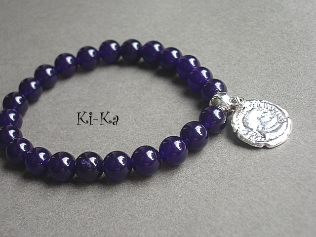 Bransoletka wykonana z naturalnych minerałów [jadeity ametystowe, 8mm] oraz z elementów w kolorze srebra [w tym starożytna moneta]. Bransoletka na gumce silikonowej. Będzie pasowała na nadgarstek 15-16,5cm. Biżuteria ozdobnie zapakowana. Bransoletka może stanowić komplet z innymi bransoletkami - przykładowe zdjęcia