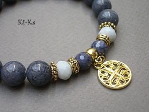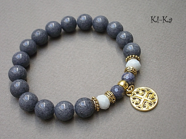 Bransoletka wykonana z kuleczek jadeitów [10mm], fasetowanych kuleczek szafirów [7mm], kryształków [8mm] oraz elementów metalowych w kolorze złota. Bransoletka na gumce silikonowej. Pasuje na nadgarstek 16-17cm. Biżuteria ozdobnie zapakowana. Możliwość dopasowania bransoletki do nadgarstka - wcześniej prosimy o kontakt.