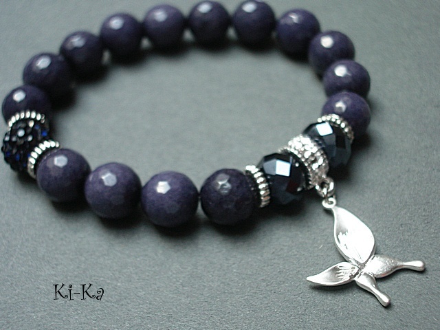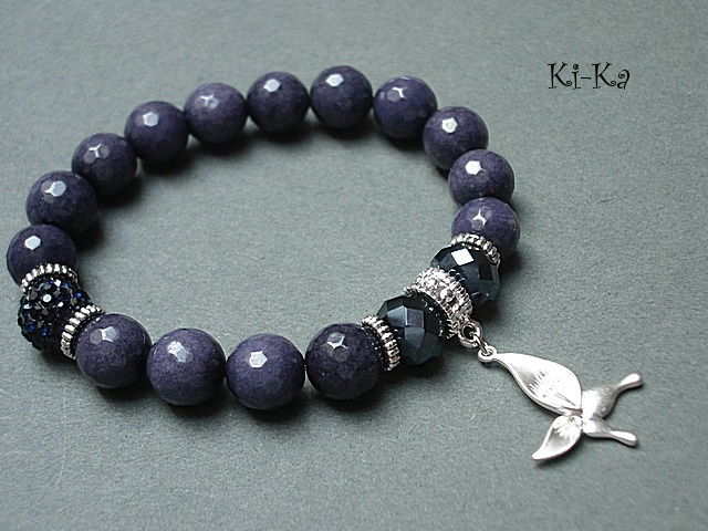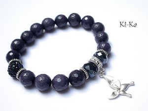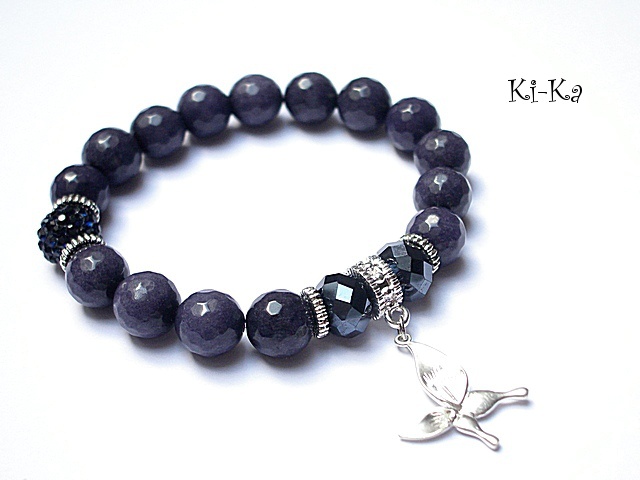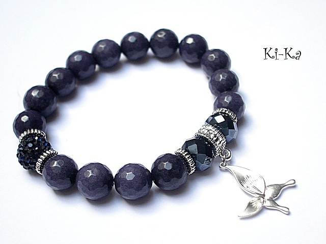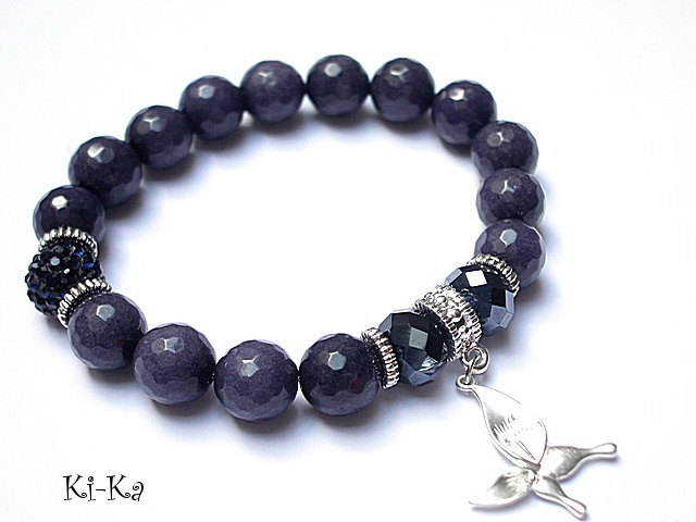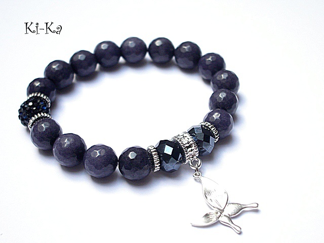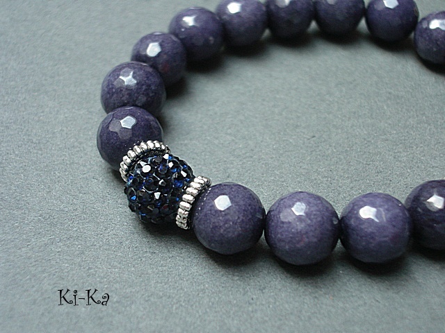 Bransoletka wykonana z kamieni naturalnych - jadeity [10mm],kryształki [10mm] ,kuleczki shamballa wysadzanej kryształkami Swarovskiego [10mm] oraz elementów w kolorze srebra. Bransoletka na gumce silikonowej. Pasuje na nadgarstek 15-16,5cm. Biżuteria ozdobnie zapakowana.