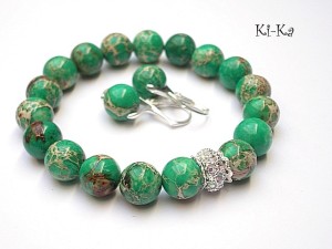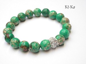 Bransoletka wykonana z naturalnych minerałów: jaspis cesarski [10mm], przekładki wysadzanej kryształkami oraz elementów w kolorze srebra. Bransoletka na gumce silikonowej. Pasuje na nadgarstek 15-16,5cm. Biżuteria ozdobnie zapakowana Bransoletka może stanowić komplet z kolczykami dostępnym w naszej galerii - zdjęcia