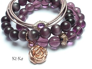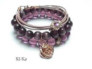 Komplet trzech bransoletek wykonany z naturalnych kamieni - uleksyt [kocie oko; 10mm] kryształków [10mm], rzemienia z naturalnej skóry oraz elementów w kolorze różowego złota. Bransoletki pasują na nadgarstek 15 -16cm. Bransoletki z kamieni i kryształków na gumce silikonowej. Biżuteria ozdobnie zapakowana.