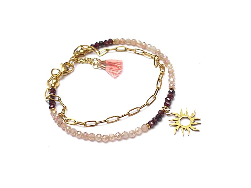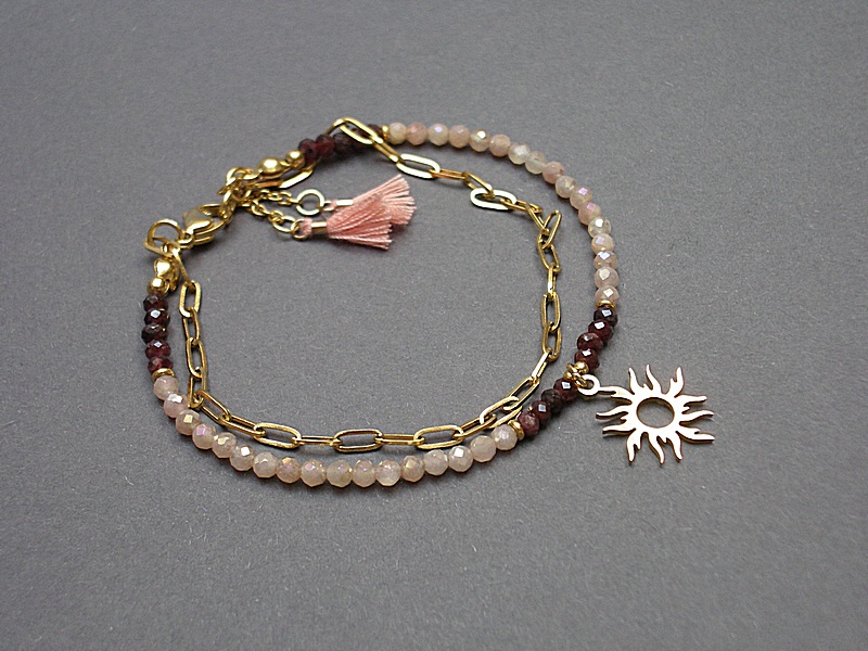 Delikatna bransoletka wykonana w całości z pozłacanej stali szlachetnej, naturalnych, szlachetnych kamieni - kamień słoneczny platerowany [3mm], fasetowane granaty [3mm] oraz chwostów. Całkowita długość bransoletki: 19,3cm. Biżuteria ozdobnie zapakowana.