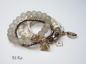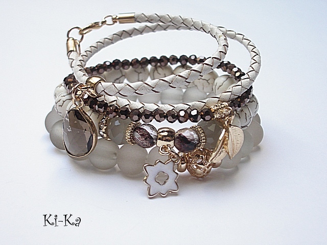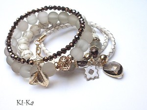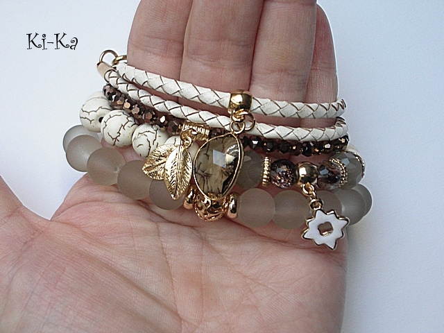 PROJEKT AUTORSKI. WŁASNOŚĆ KI-KA. KOPIOWANIE ZABRONIONE. Komplet czterech bransoletek wykonanych z naturalnych kamieni - howlity [10mm] , kwarc czekoladowy [8mm], szkło matowe [10mm], kryształków fasetowanych [6mm i 8 x 10mm] , rzemienia z naturalnej, plecionej skóry, efektownej zawieszki w oprawie oraz elementów metalowych w kolorze tzw. różowego złota. Bransoletki pasują na nadgarstek 16-17cm. Biżuteria ozdobnie zapakowana