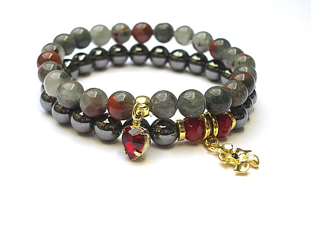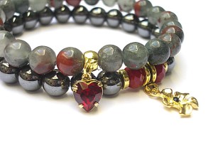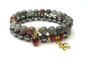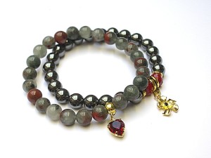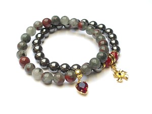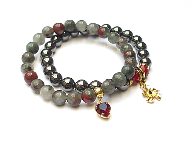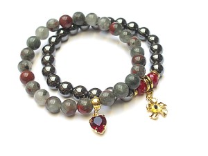 Komplet dwóch bransoletek wykonanych z kul naturalnych kamieni - jaspis [8mm], hematyt [8mm] , kryształków fasetowanych [6 x 8mm], zawieszki z metalu pokrytej srebrem pr. 925 [pozłacanej 18k złotem] i wysadzanej kryształkiem Swarovskiego [Siam] oraz elementów metalowych w kolorze złota. Bransoletki pasują na nadgarstek 16 17cm. Biżuteria ozdobnie zapakowana