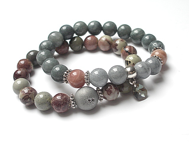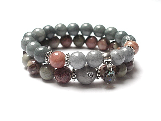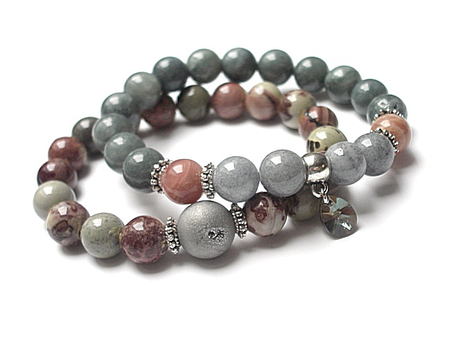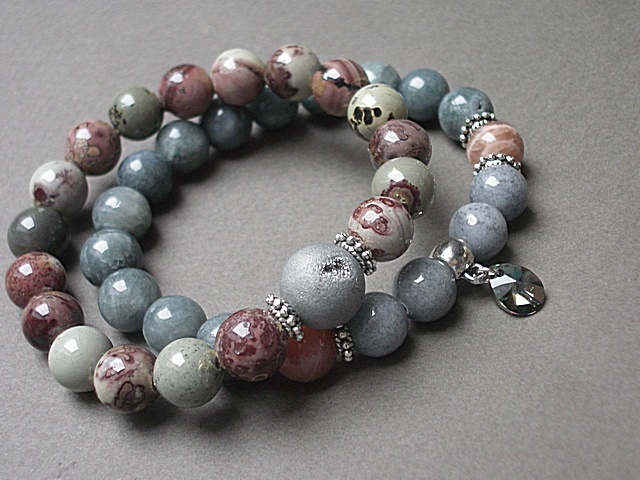 Komplet dwóch bransoletek wykonany z kamieni naturalnych - jadeity [10mm], jaspisy [10mm], kamień słoneczny [10mm], druza agatu z efektownym pęknięciem [12mm], zawieszki z kryształka Swarovskiego oraz elementów metalowych w kolorze srebrnym. Pasują na nadgarstek 16-17cm. Bransoletki z kamieni na gumce silikonowej. Projekt autorski. Naśladownictwo zabronione. Praca datowana.