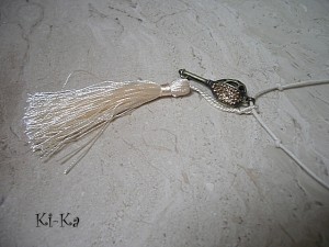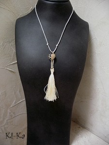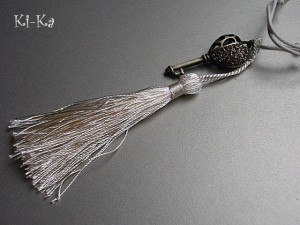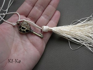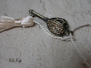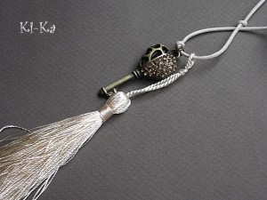 Naszyjnik wykonany z elementów metalowych - klucz wysadzany kryształkami [45mm] oraz satynowego chwostu, zawieszonym na sznurku woskowanym w kolorze ecru. Całkowita długość naszyjnika 57cm. Biżuteria ozdobnie zapakowana.