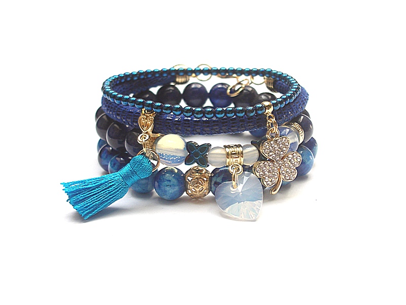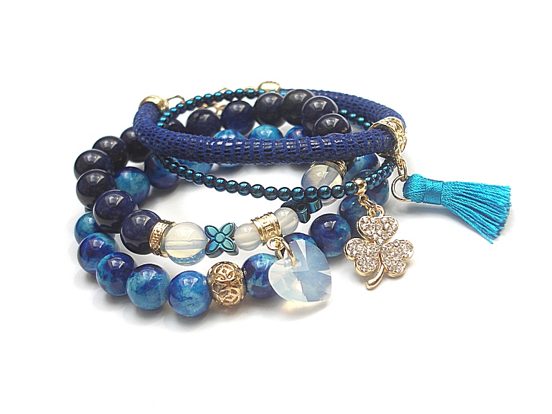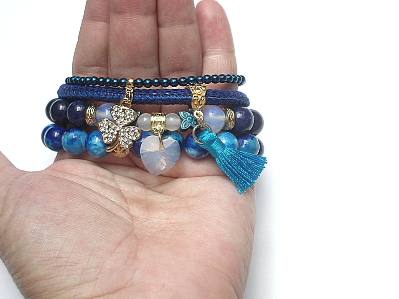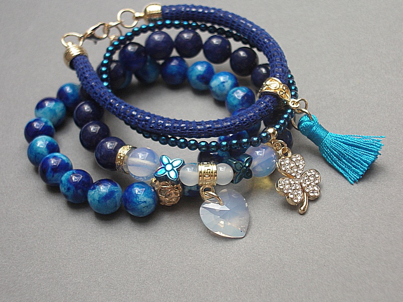 Komplet czterech bransoletek wykonanych z naturalnych kamieni: jadeity [10mm], hematyty [3mm], hematytowe kwiatki [8mm], opality [10mm], agaty [6mm], przywieszki z kryształka Swarovskiego, przywieszki z cyrkoniami, chwosta, skórzanego rzemienia ze skórki naturalnej oraz elementów metalowych w kolorze złotym. Bransoletki pasują na nadgarstek 16-17cm. Biżuteria ozdobnie zapakowana.