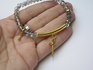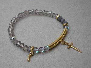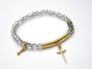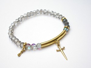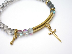 PROJEKT AUTORSKI. Bransoletka z kolekcji "MINI RICH" charakteryzującej się wykorzystaniem w jednej bransoletce - mixu minerałów, kryształków, elementów ozdobnych, kryształków Swarovskiego, cyrkonii, przywieszek etc. . Model jest w sam sobie na tyle strojny, że nie wymaga uzupełnienia go dodatkowymi akcentami. Delikatna bransoletka wykonana z naturalnych kamieni - kwarc mystic [6mm], kryształków fasetowanych [6 x 4mm] oraz elementów w kolorze złota. Bransoletka na gumce silikonowej. Pasuje na nadgarstek 16-17cm. Biżuteria ozdobnie zapakowana. Możliwość dopasowania bransoletki do nadgarstka - wcześniej prosimy o kontakt.