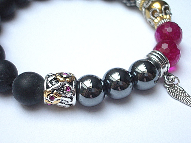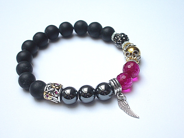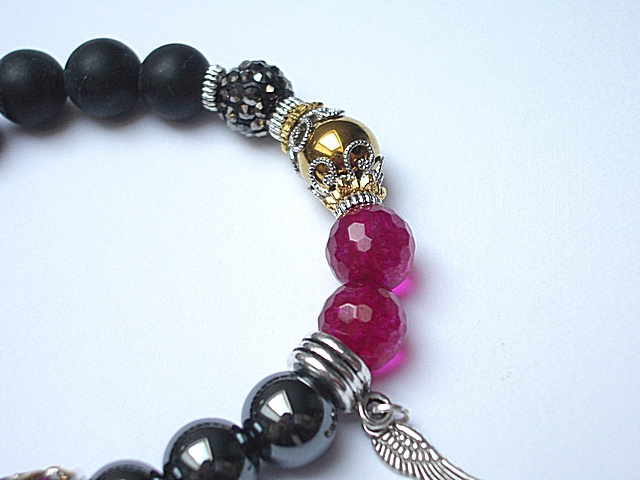 PROJEKT AUTORSKI. Bransoletka z kolekcji "RICH" charakteryzującej się wykorzystaniem w jednej bransoletce - mixu minerałów, kryształków, elementów ozdobnych, kryształków Swarovskiego, cyrkonii, przywieszek etc. . Model jest w sam sobie na tyle strojny, że nie wymaga uzupełnienia go dodatkowymi akcentami. Bransoletka wykonana z naturalnych kamieni - matowy black stone [10mm], fasetowany kwarc [10mm] ,kuleczki shamballa wysadzanej kryształkami Swarovskiego [10mm] ,przekładki z cyrkoniami oraz elementów w kolorze złotym i srebrnym . Bransoletka na gumce silikonowej. Pasuje na nadgarstek 16-17cm. Biżuteria ozdobnie zapakowana. Możliwość dopasowania bransoletki do nadgarstka - wcześniej prosimy o kontakt.