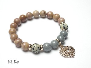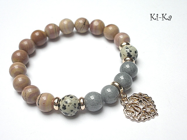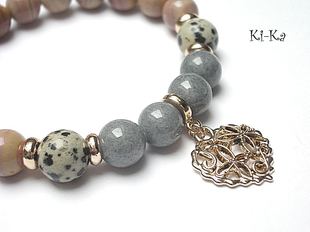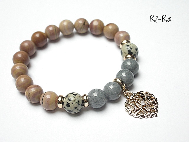 PROJEKT AUTORSKI. WŁASNOŚĆ KI-KA. KOPIOWANIE ZABRONIONE. Bransoletka z kolekcji RICH charakteryzującej się wykorzystaniem w jednej bransoletce - mixu minerałów, kryształków, elementów ozdobnych, kryształków Swarovskiego, cyrkonii, przywieszek etc. . Model jest w sam sobie na tyle strojny, że nie wymaga uzupełnienia go dodatkowymi akcentami. Bransoletka wykonana z naturalnych kamieni - jaspis [10mm],marmur [10mm] oraz elementów w kolorze bladego złota. Bransoletka na gumce silikonowej. Pasuje na nadgarstek 16-17cm. Biżuteria ozdobnie zapakowana. Możliwość dopasowania bransoletki do nadgarstka - wcześniej prosimy o kontakt.