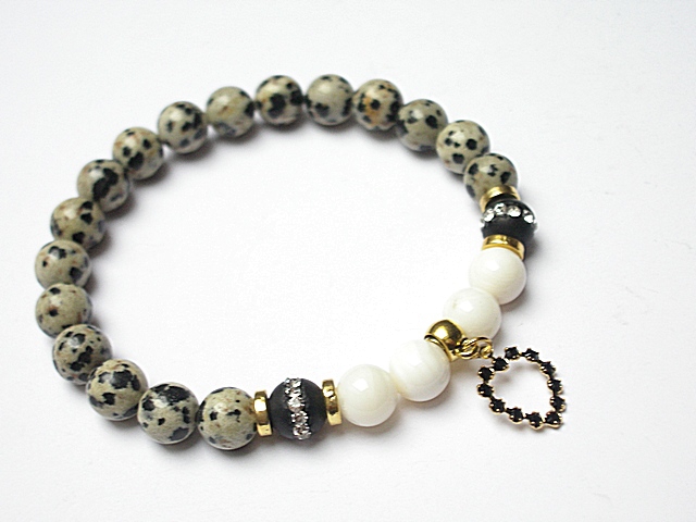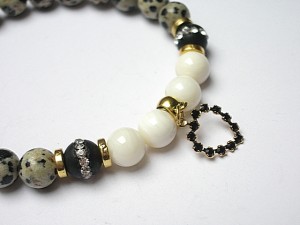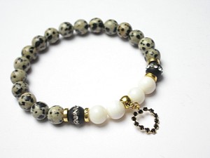 PROJEKT AUTORSKI. WSZELKIE INNE PODOBNE MODELE TO KOPIE NARUSZAJĄCE PRAWA AUTORSKIE. Bransoletka z kolekcji RICH charakteryzującej się wykorzystaniem w jednej bransoletce - mixu minerałów, kryształków, elementów ozdobnych, kryształków Swarovskiego, cyrkonii, przywieszek etc. . Model jest w sam sobie na tyle strojny, że nie wymaga uzupełnienia go dodatkowymi akcentami. Bransoletka wykonana z naturalnych kamieni - onyks wysadzany cyrkoniami [8mm], jaspis dalmatyńczyk [8mm], muszli [8mm], zawieszki z metalu pokrytej srebrem pr. 925 [pozłacanej 18k złotem] i wysadzanej kryształkami Swarovskiego [Jet] 19 x 12mm] oraz elementów w kolorze złota. Bransoletka na gumce silikonowej. Pasuje na nadgarstek 16-17cm - możliwość dopasowania do innego nadgarstka